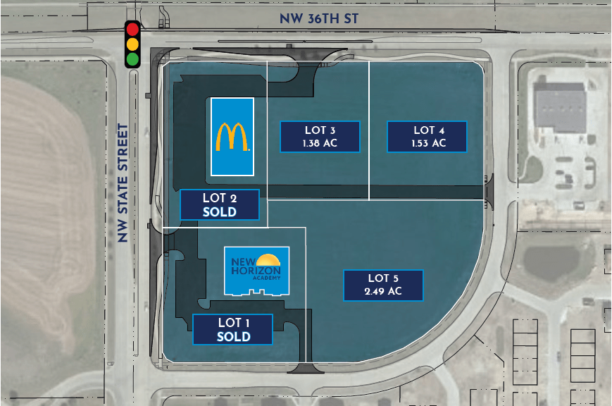 A 9 acre development parcel with multiple lots at the corner of NW 36th Street and NW State Street in Ankeny. Lots are available for mixed-use, office, retail, and restaurant uses.